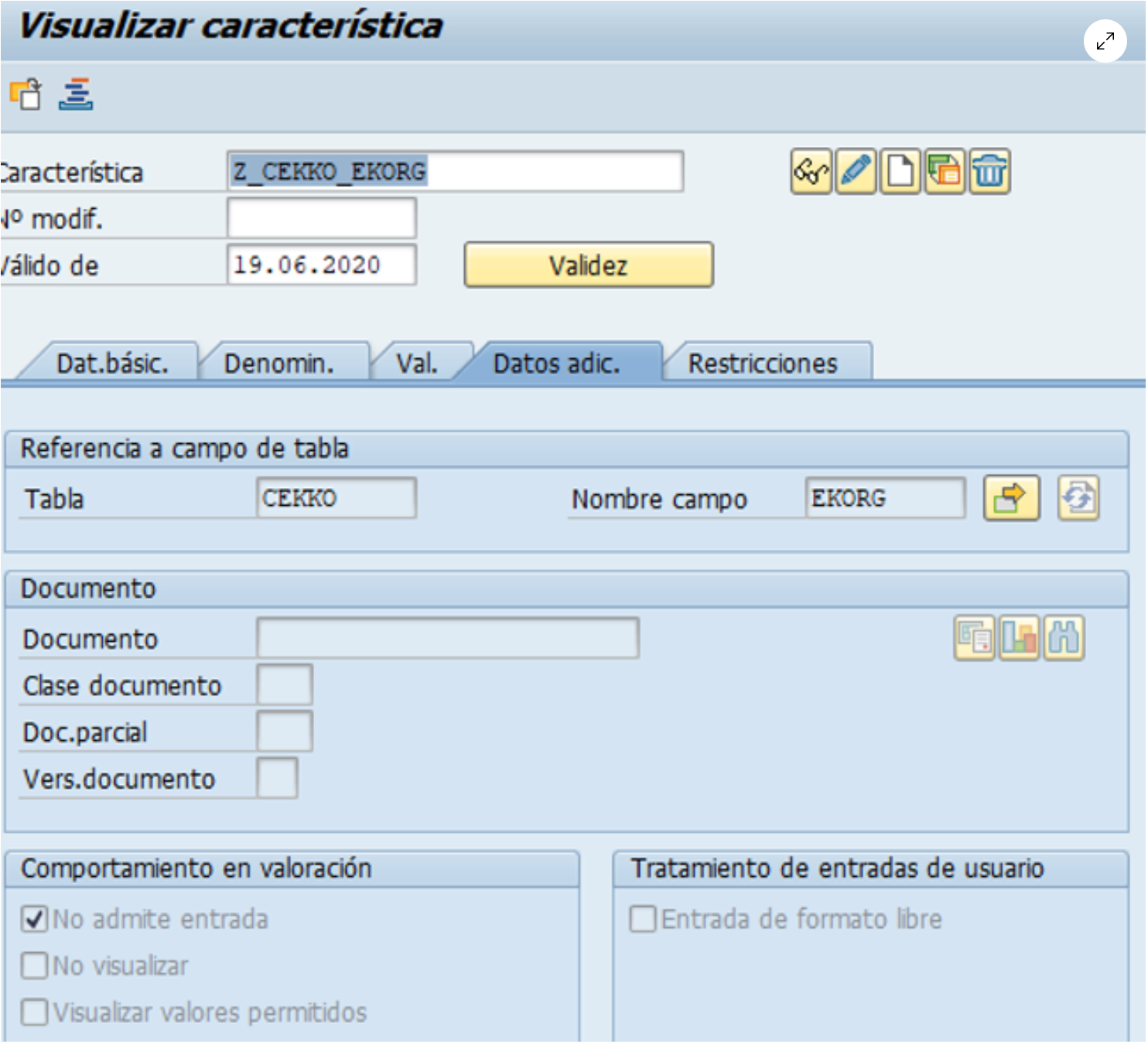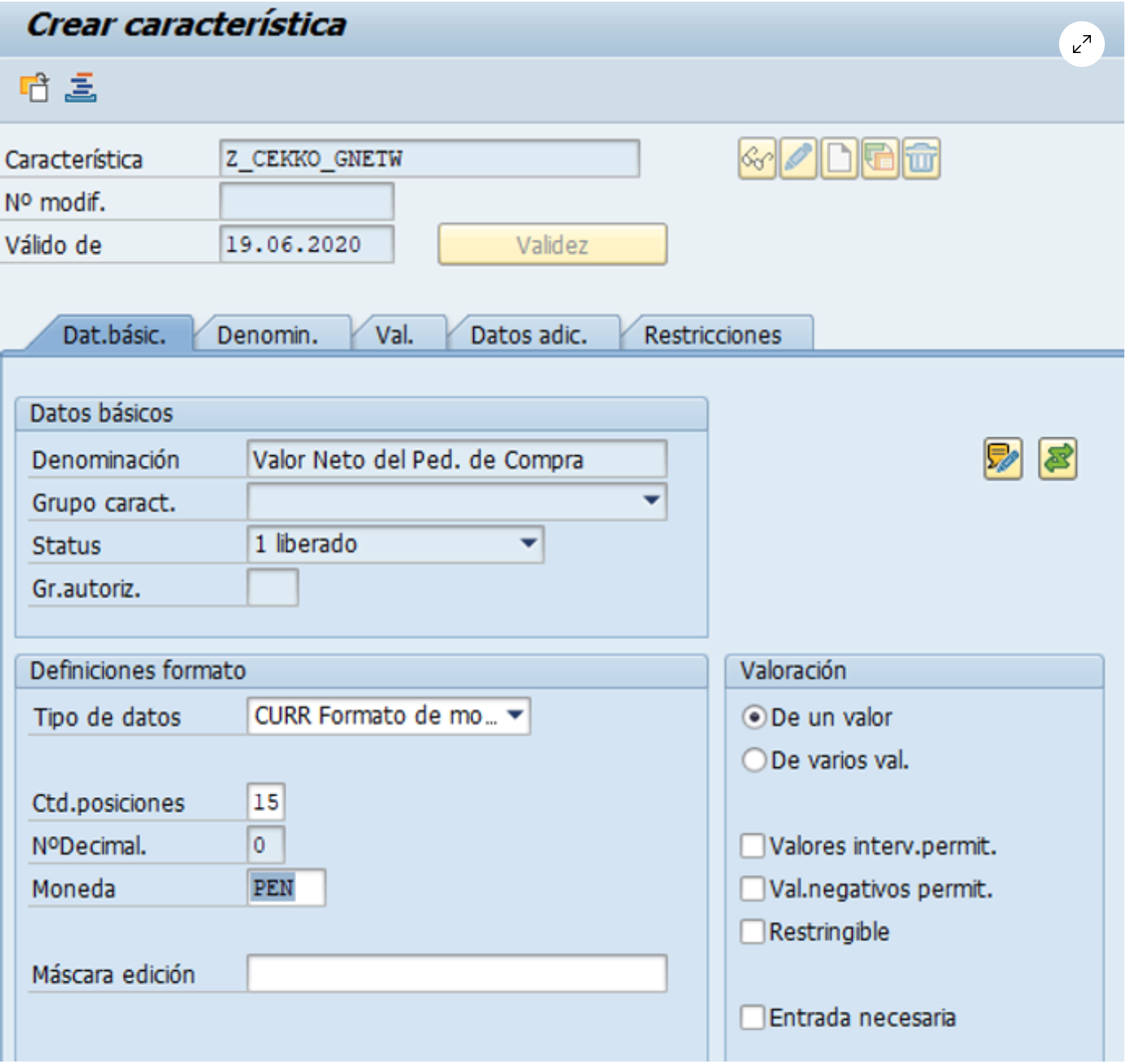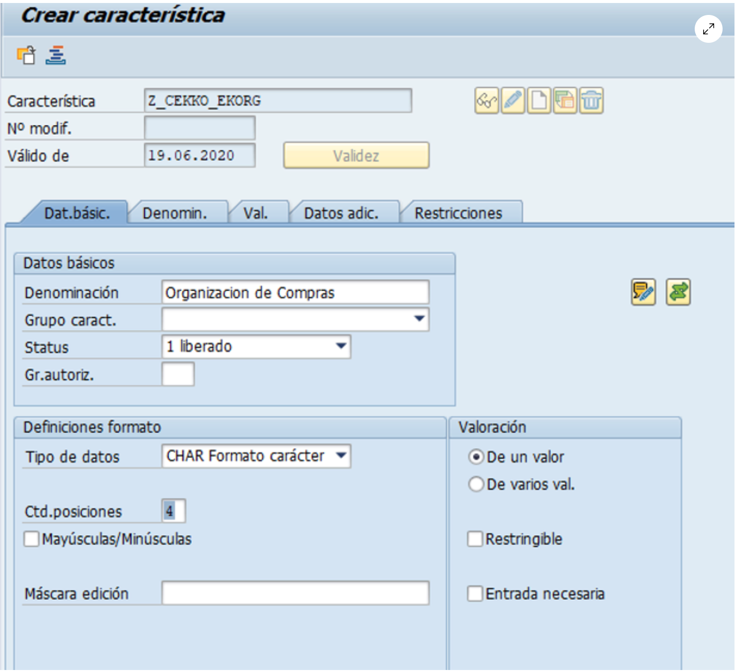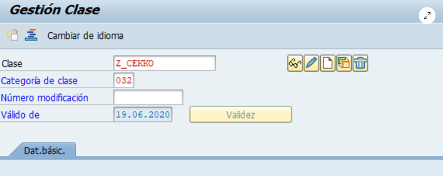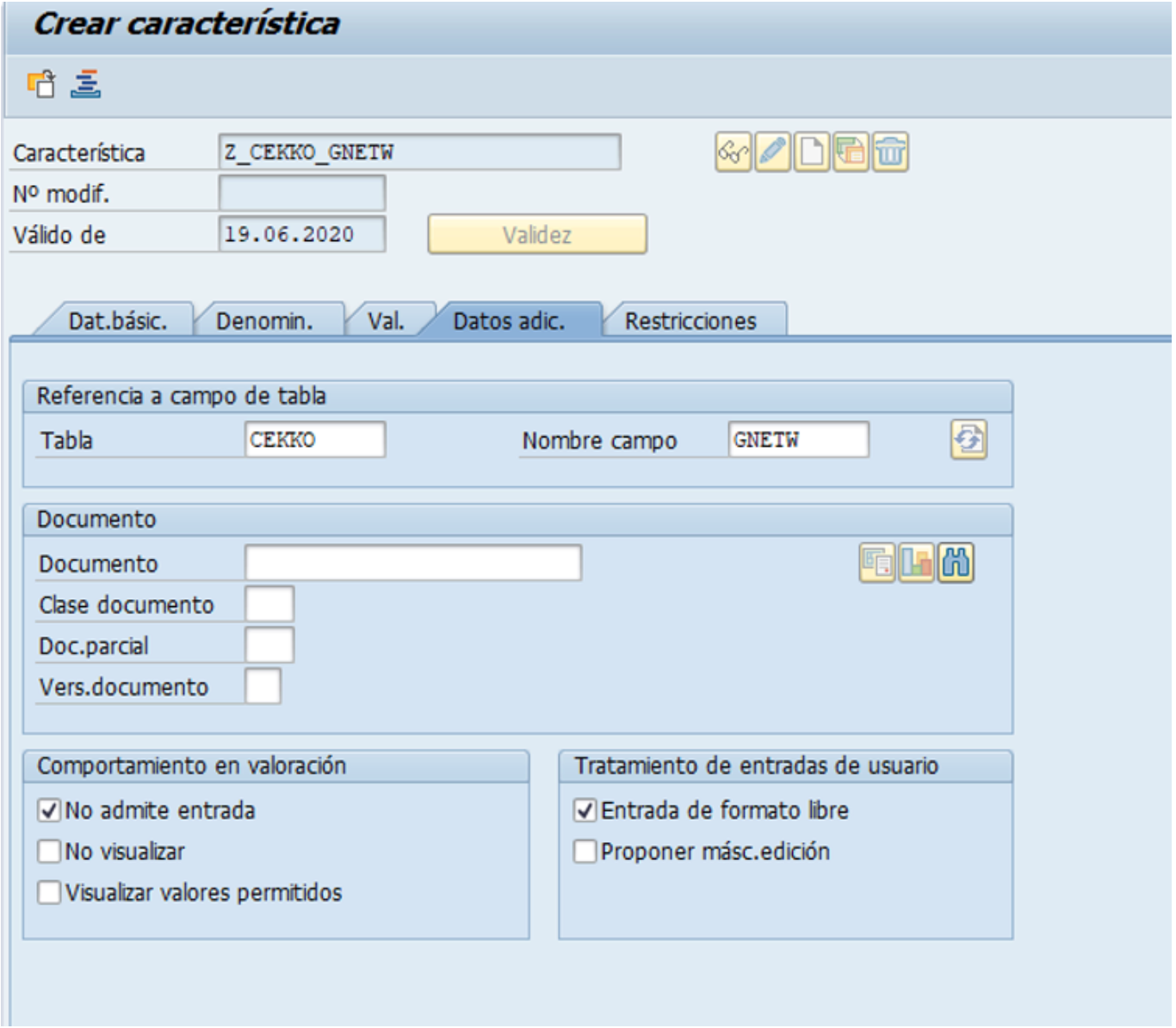 En esta ruta, SAP no mostrara la siguiente pantalla, escribiremos en el campo característica Z_CEKKO_GNETW, y luego damos clic en el botón nuevo.